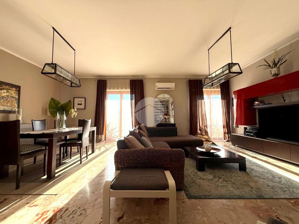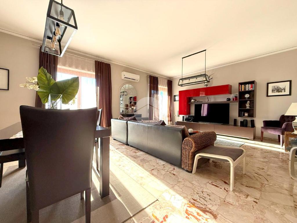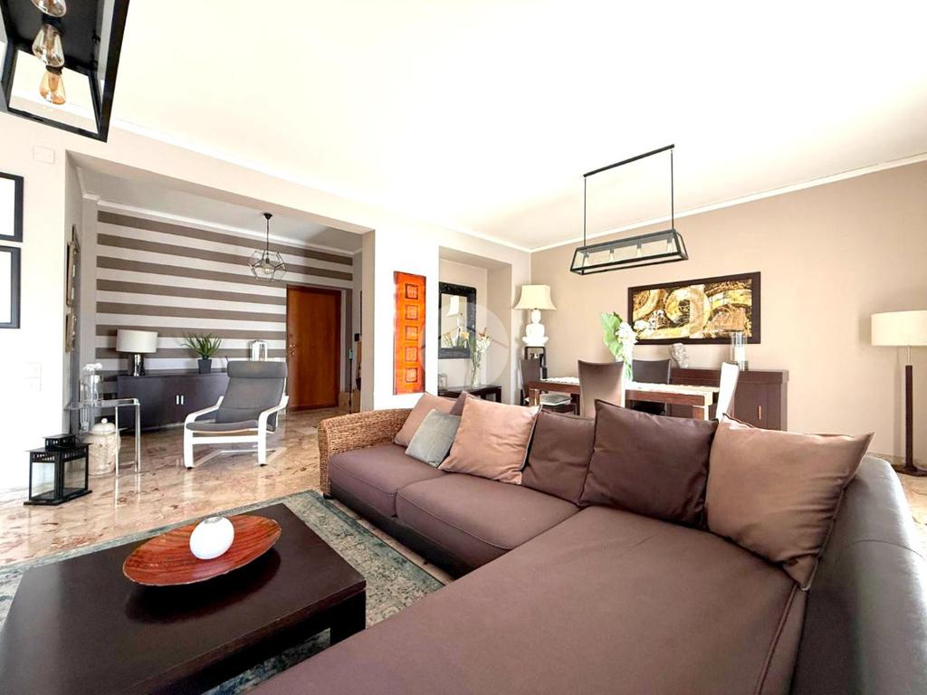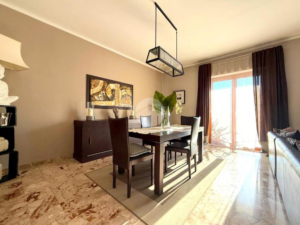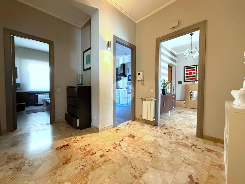 L'appartamento presenta finiture di qualità, tra cui pavimenti in elegante segato di marmo in tutti gli ambienti principali, gres porcellanato nei servizi, infissi in alluminio effetto legno con vetrocamera, e riscaldamento centralizzato.