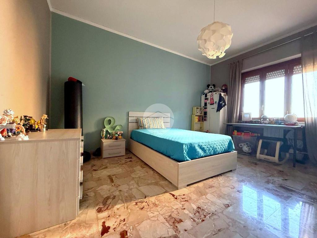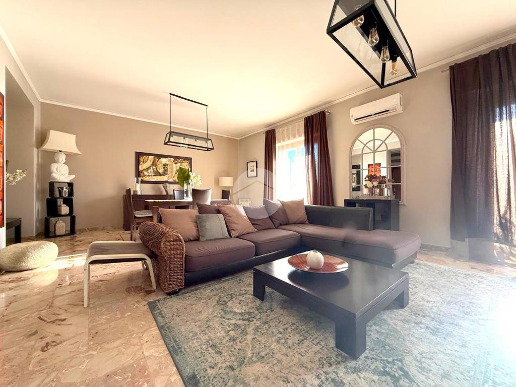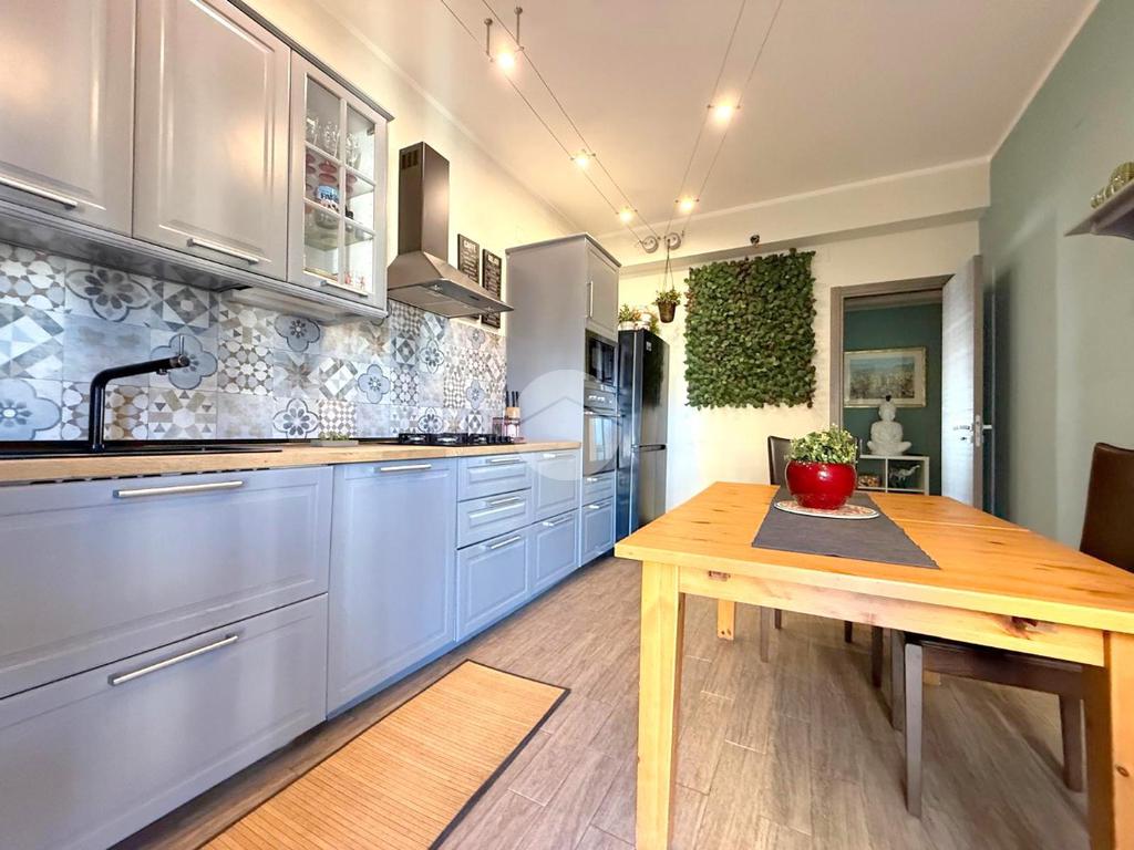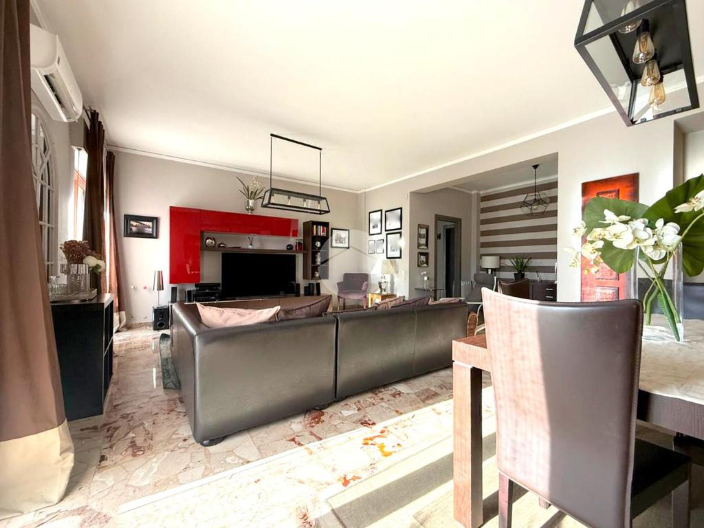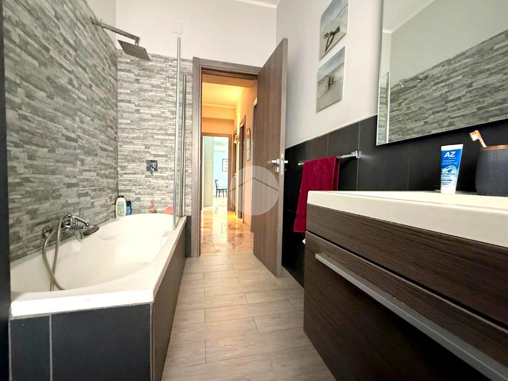 L'appartamento presenta finiture di qualità, tra cui pavimenti in elegante segato di marmo in tutti gli ambienti principali, gres porcellanato nei servizi, infissi in alluminio effetto legno con vetrocamera, e riscaldamento centralizzato.